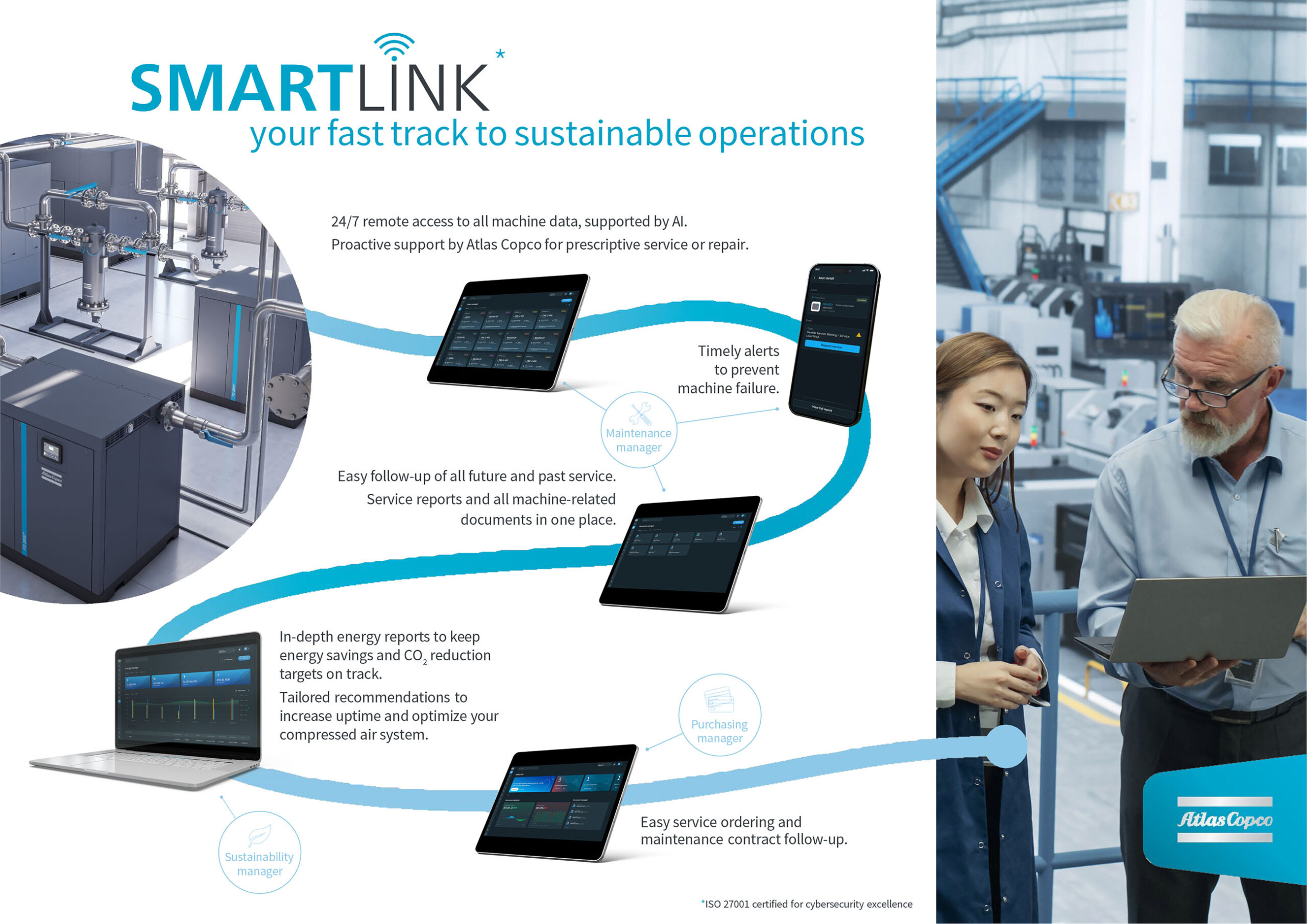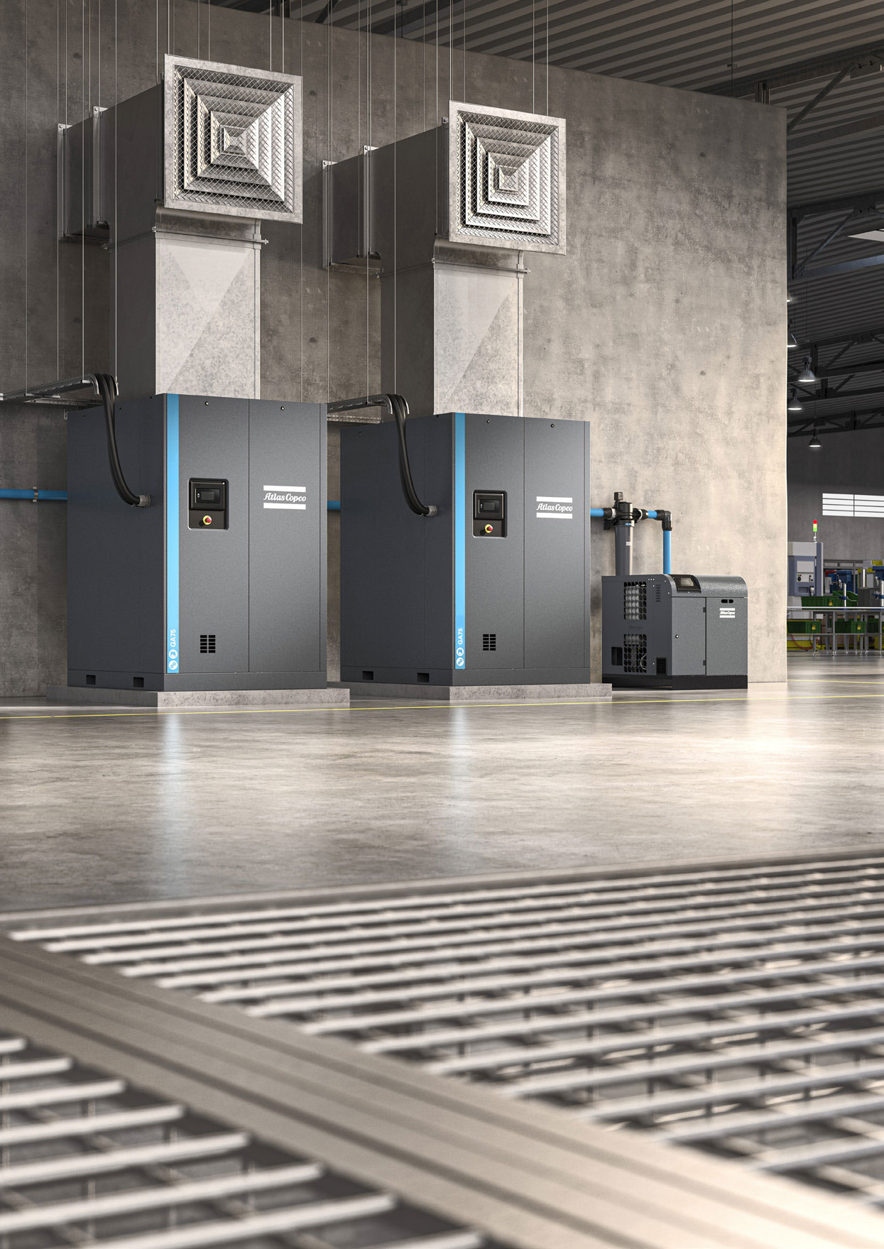 Atlas Copco’s industrial oil-injected screw compressors deliver outstanding sustainability, reliability, and performance while keeping your total cost of ownership low. With the G 37-75 and premium GA 37-90 ranges, you can choose the model that best fits your air demand and production needs. Designed to perform in the toughest conditions, these compressors ensure efficient, dependable operation for years to come
